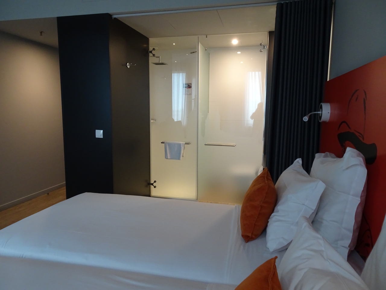 部屋は不思議な造りで、ベッドの直ぐ脇にシャワールームとトイレがあるのですが、扉がガラスで(下の方はぼかしが入っていますが)、ほぼ丸見えです。カーテンをひいて見えないようにもできますが、トイレに入る度にいちいちカーテンを閉めるのは面倒なので、一人旅あるいは家族利用以外にはおススメできないデザインです。