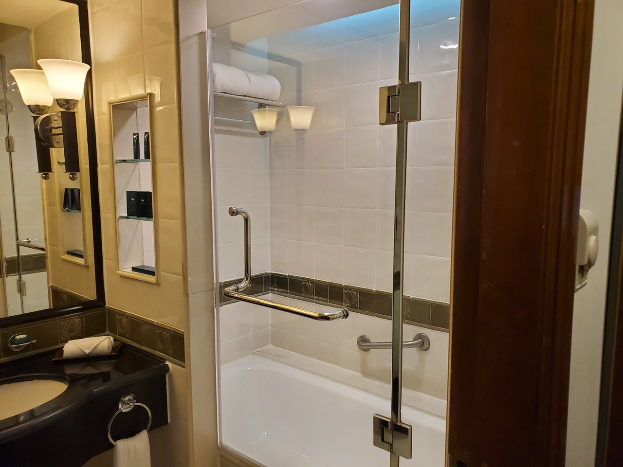 【バス】一番安い部屋にもバスタブ有り。シャワー水圧は中くらい。ガラス扉は隙間有り。シャワーのお湯が漏れて、床が水浸しに( ;∀;)