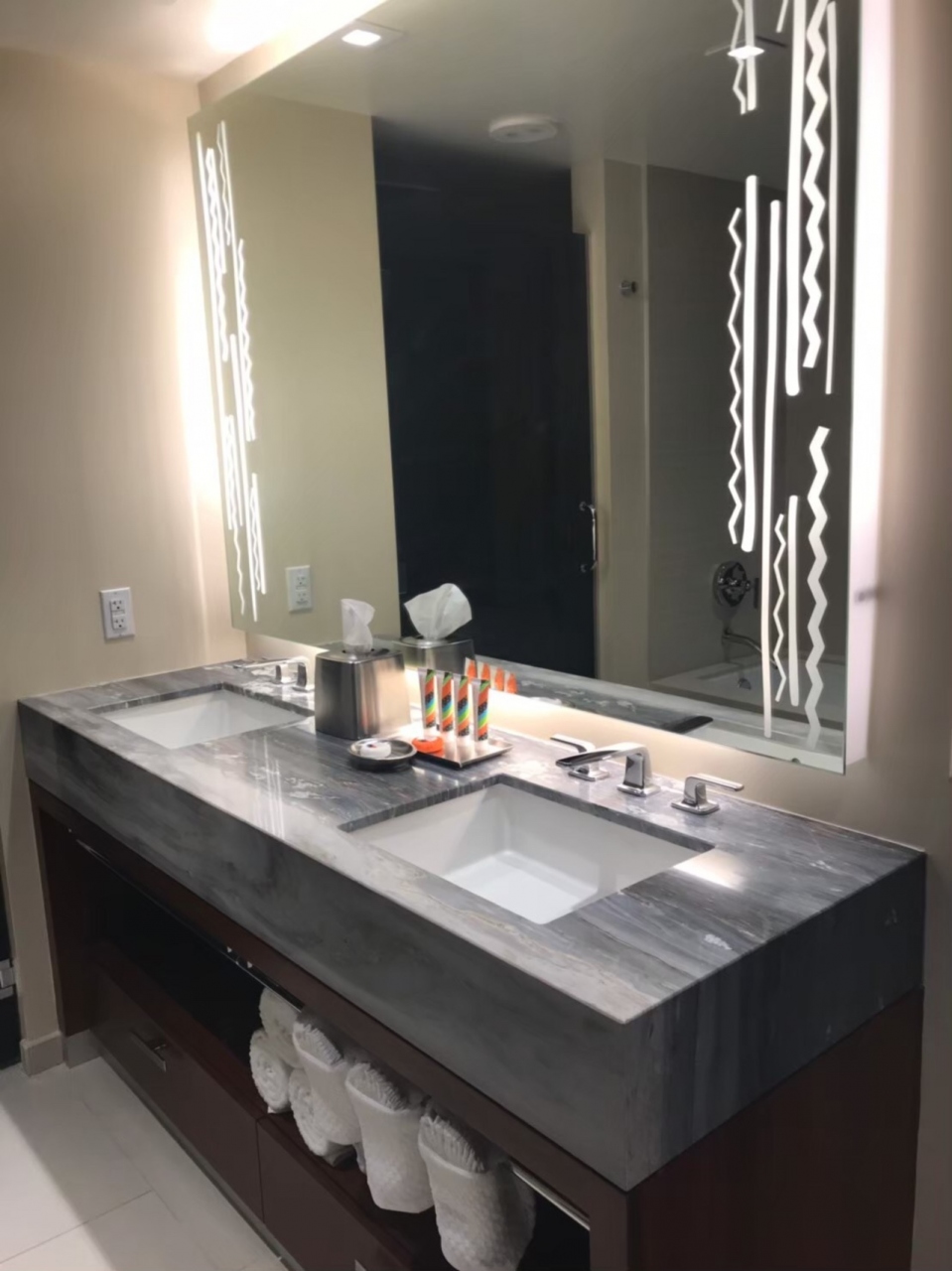 唯一の難点はバスルーム。シャワーが固定式で水量も弱めなのでシャンプーした頭を流すのにひと苦労。独立シャワールームはドアの下に隙間があるらしくドアの外側まで水が漏れ、バスルームの床がビショビショ。バスマットもビショビショ。あれは改善されるべき点ですね。