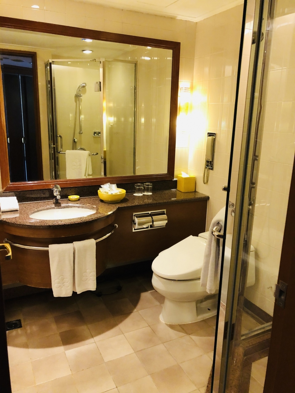 大連観光で3連泊しましたがバスルーム、トイレ(ウオシュレット付)、備品等満足できる内容でした。(但しベッドは古いので❓)朝食はメニュー豊富は当たり前で、牛、豚、鳥、魚、卵等その場で調理してくれます。難点はエレベーターが4機しか無く35階建ての客室数からは少な過ぎですネ!
