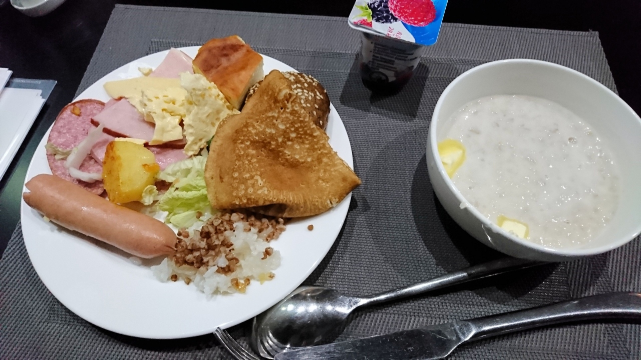朝食はバイキング形式で、カーシャも蕎麦のものもあった(写真は麦のもの)