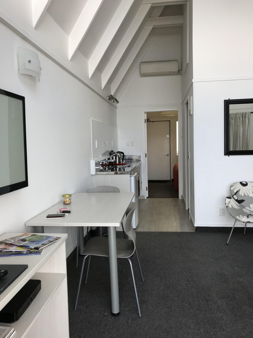 部屋はウナギの寝床式で入るとまずワンルームになったリビングスペースとキッチン、その脇にバスルーム、さらに奥にベッドルームがあって、そのさらに奥にホットタブといっていましたが、お湯が張ってあるバスタブがありました。真ん中にあるバスルームはシャワーブースとトイレ、洗面所の一体型です。それぞれにバスタオルと足ふきマットがありました。
