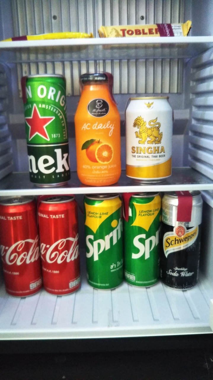 良い点は、エグゼクティブルームの冷蔵庫内のソフトドリンクとビールが無料になった。【compliment】のシールが貼られた飲料が対象なのでそれ以外は有料。わからない時はラウンジスタッフに確認を!