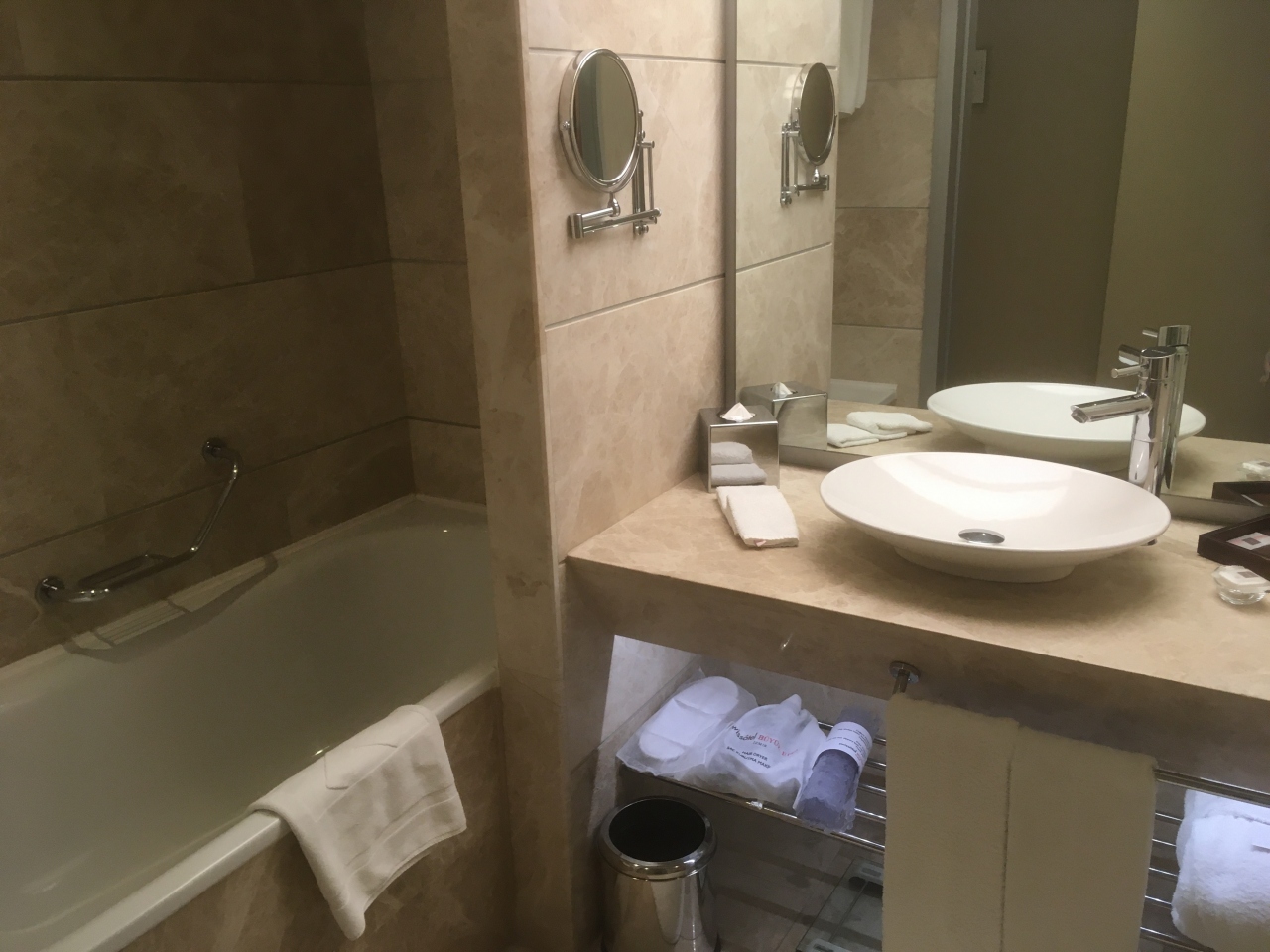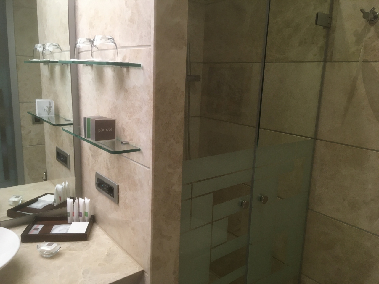 入口でセキュリティチェックがあり、スタッフの数も多く客層も良い、高級ホテルでした。お部屋も広く、バスタブとシャワールームが分かれておりスリッパや無料のペットボトルのお水も2本置いてありました。wifi速度も問題ありませんでした。外出はしませんでしたが、周りにお店は多かったようです。