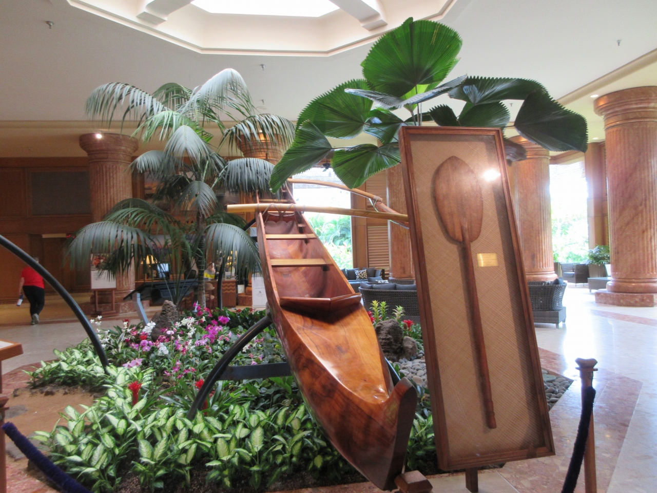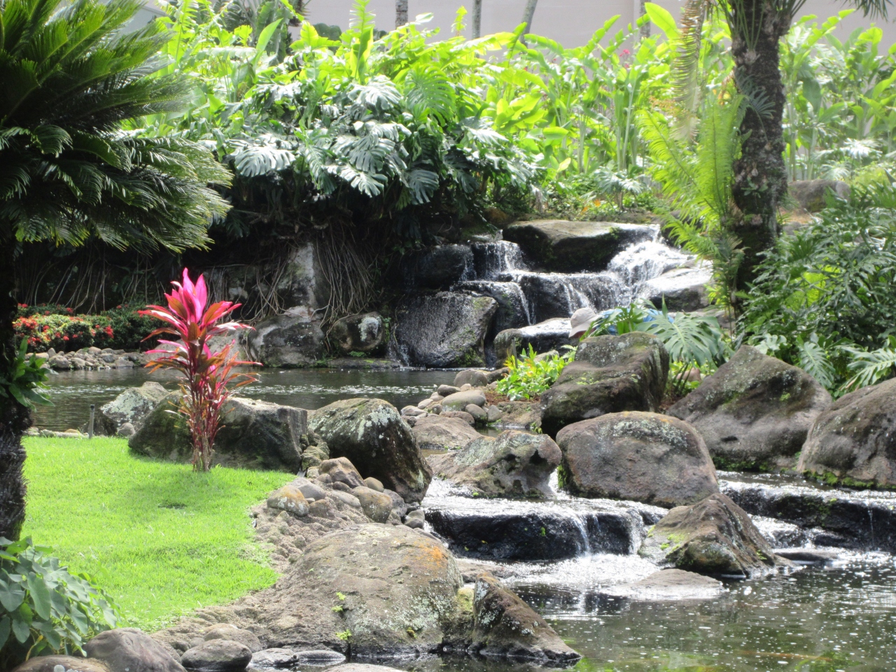 カパラキビーチのほぼ中心に海を臨むとても良いロケーションに建てられている。中庭があり日本庭園があり、小さな階段状の滝から水が流れ、水が流れ込む池には多数の鯉が泳いでいた。ロビーには木製のカヌーが展示されていて歴史を感じさせた。