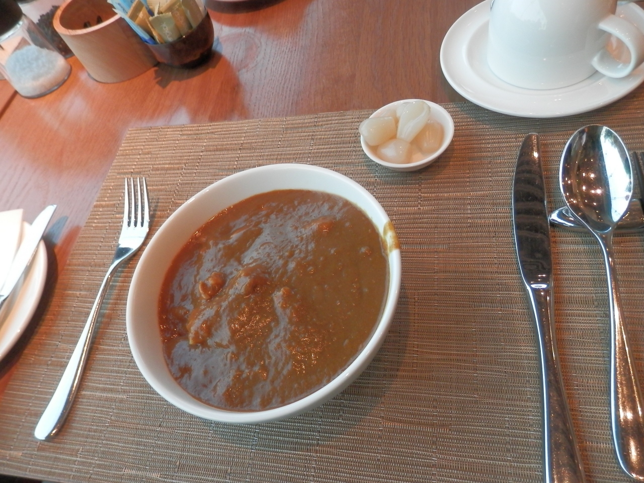 ホテルニッコウバンコクの朝食会場。赤い炊飯器。しゃもじは水につけてあります。左のどんぶりはラッキョウと福神漬け。ありがたいです。山盛りにしていただいたカレーライスはけっこうな量でした。これからツアーに出かけますので短時間でも食べることができて満足できます。カレーは腹持ちもしっかりです。