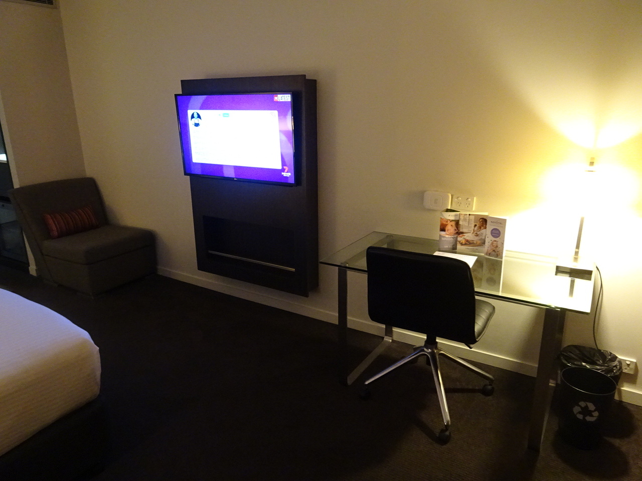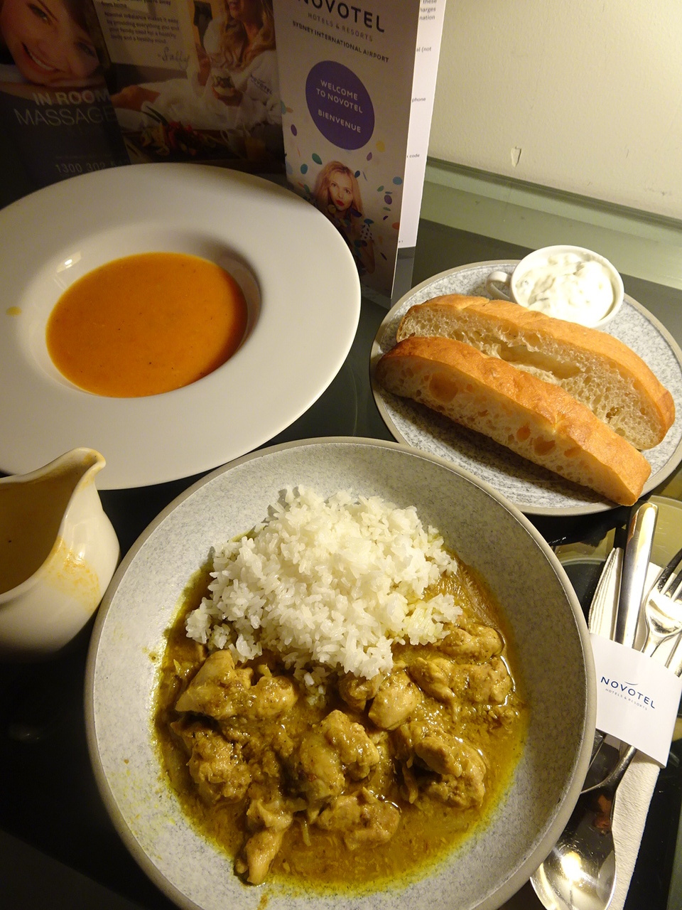 航空会社の手配で50オーストラリアドルまでのルームサービスが付いていて、チキンカーマカレー&ライス、本日のスープ(パン付き)を注文し、カレーが美味しかったです。