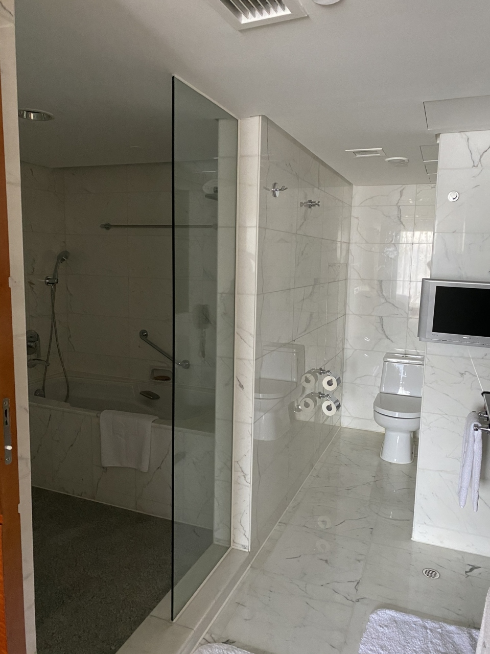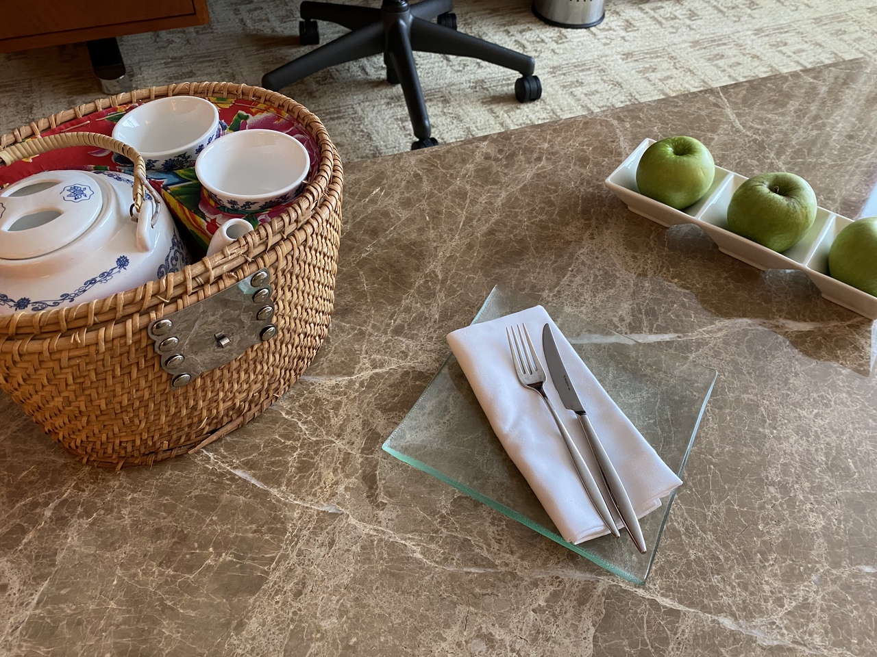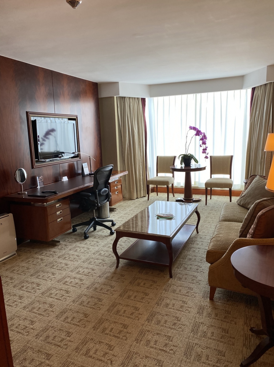 情勢が少し落ち着いた様子だったので格安価格を利用し憧れのシャングリラへ。個人旅行者の特権?チェックイン時にハーバービューを希望したら希望には添えないけれど、とホライゾンクラブ(食事、ラウンジ利用なし)へアップグレード。広いお部屋、キングサイズベッド、たっぷりのお湯とふんわりタオルで快適お風呂生活!と舞い上がりましたが、リビングルームの照明は暗いし空調が調節できないため暖房を借りるはめに。夜は空調の音がうるさく、そういう部屋だからだったのかな、と。ベッドサイドにコンセントがないのはとても残念でしたが、デモの影響もなく格安で宿泊できたので良い思い出となりました