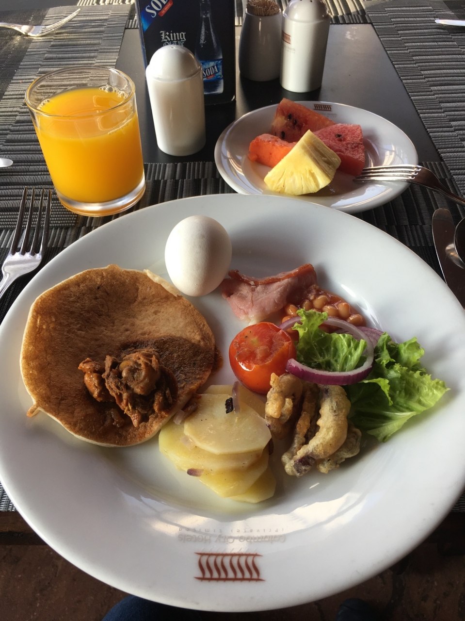 シャワー、トイレ、ミネラルウォーター、エアコン、エレベーター完備と高級さを求めずダッチホスピタル横、ワールドトレードセンター向かいという町の中心部に位置してるのは短期滞在には極めて便利。朝食は最上階のレストランにて。1階にあのメイソウが入ってます(笑)
