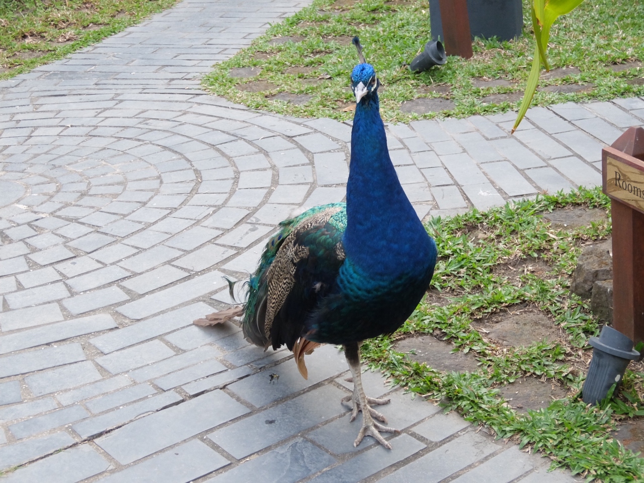 敷地内には孔雀が居て、朝は孔雀の鳴き声で起こされます。