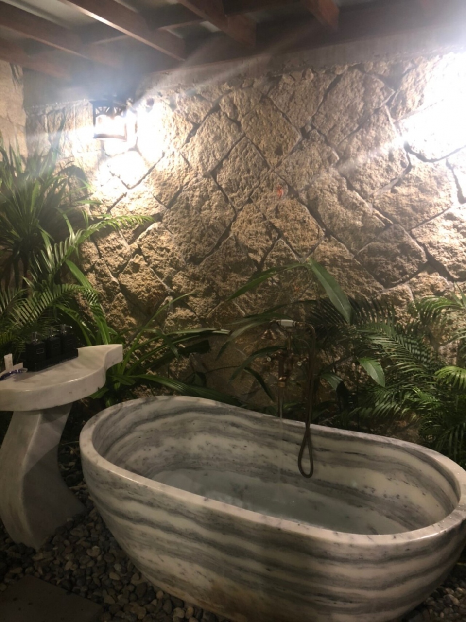 お風呂は半屋外ですが、もちろん周りから覗かれるような事はありません。でもシャワーの水圧がかなり弱かったのが難点でした。