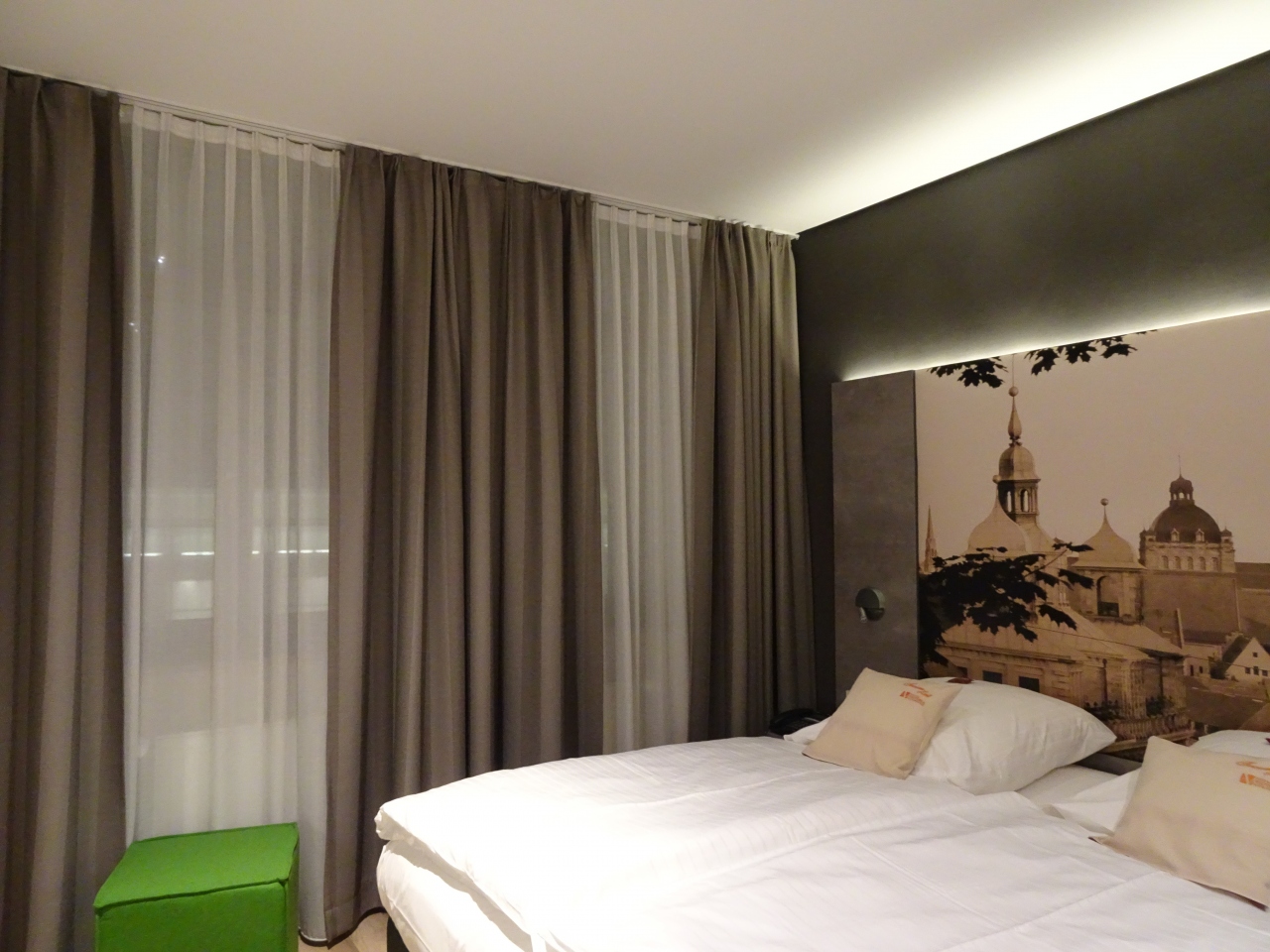 ニュルンベルグ中央駅前の横断歩道を渡り、職人広場を抜けてフラウエントーア塔のすぐ前です。ニュルンベルグ新美術館に接しており、美術館側の部屋からは廊下の作品が遠く鑑賞できます。ホテルのサイトからの予約が一番安かったです。Bathtub付き Double Relax Room(18-20㎡)で158€で、朝食とWelcome Drink付、レープクヘンシュミットの小レープクーヘンがベッドサイドに置いてありました。Eco重視で部屋にはPrivate Amenityなし、水なし,ポットなしでした。クリスマスマーケット開催中で、Welcome Drinkにはグリューワインをいただきました。