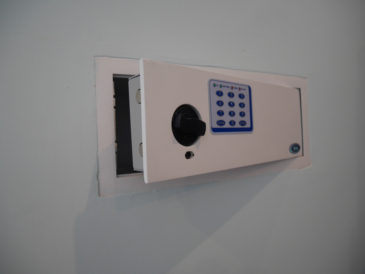 部屋は広くはないけど機能的。セーフティボックスは壁に埋め込まれていて、これなら金庫ごと持っていかれることもなくて安心ですね(笑)