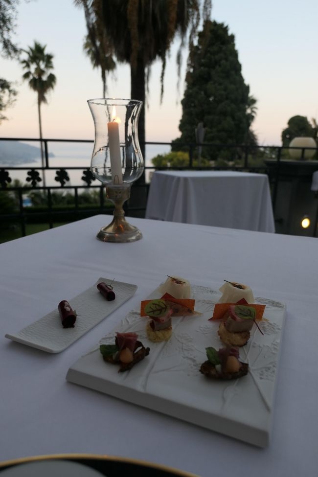 煌めく庭園、遠くに北へ延びる海岸に沿った街の夜景、遠くのカラブリア州の星屑のように瞬き、幻想的。