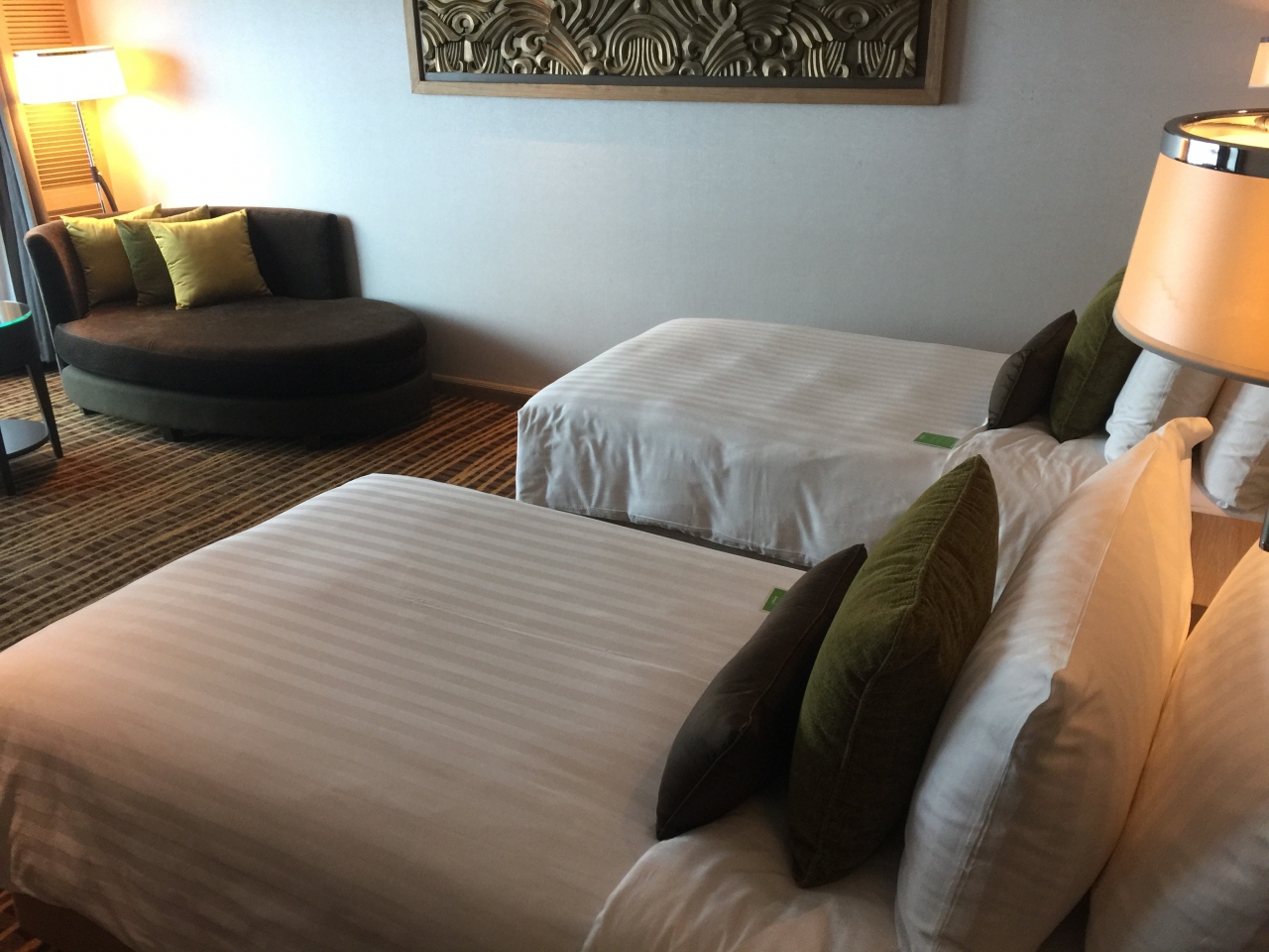 部屋はデラックスツインルームですが、かなり広いです。ソファーとビジネスデスクがあり、高層ビルですので、バンコク市内が見渡せます。ベッドも足元が窓側になる配置となっており、二人そろって喧嘩することなく夜景が見られます。また、洗面台が2つあり、シャワールームとバスタブが別々にあり、トイレもある意味孤立しています。どう言えば伝わるのかトイレの扉がバスルームの扉なんです。こんな方法があったのかと思いました。なお、アメニティには歯ブラシも付いていました。ミネラルウォーターは瓶でした。