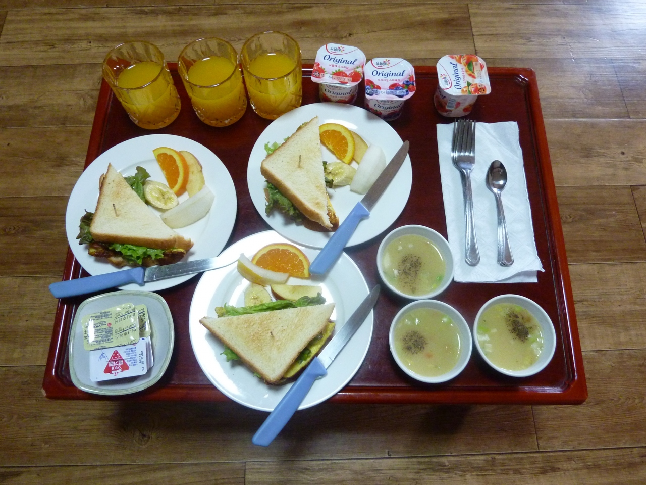 食事は朝食のみでサンドイッチ・フルーツ・ヨーグルト・スープ・ジュースでした。
