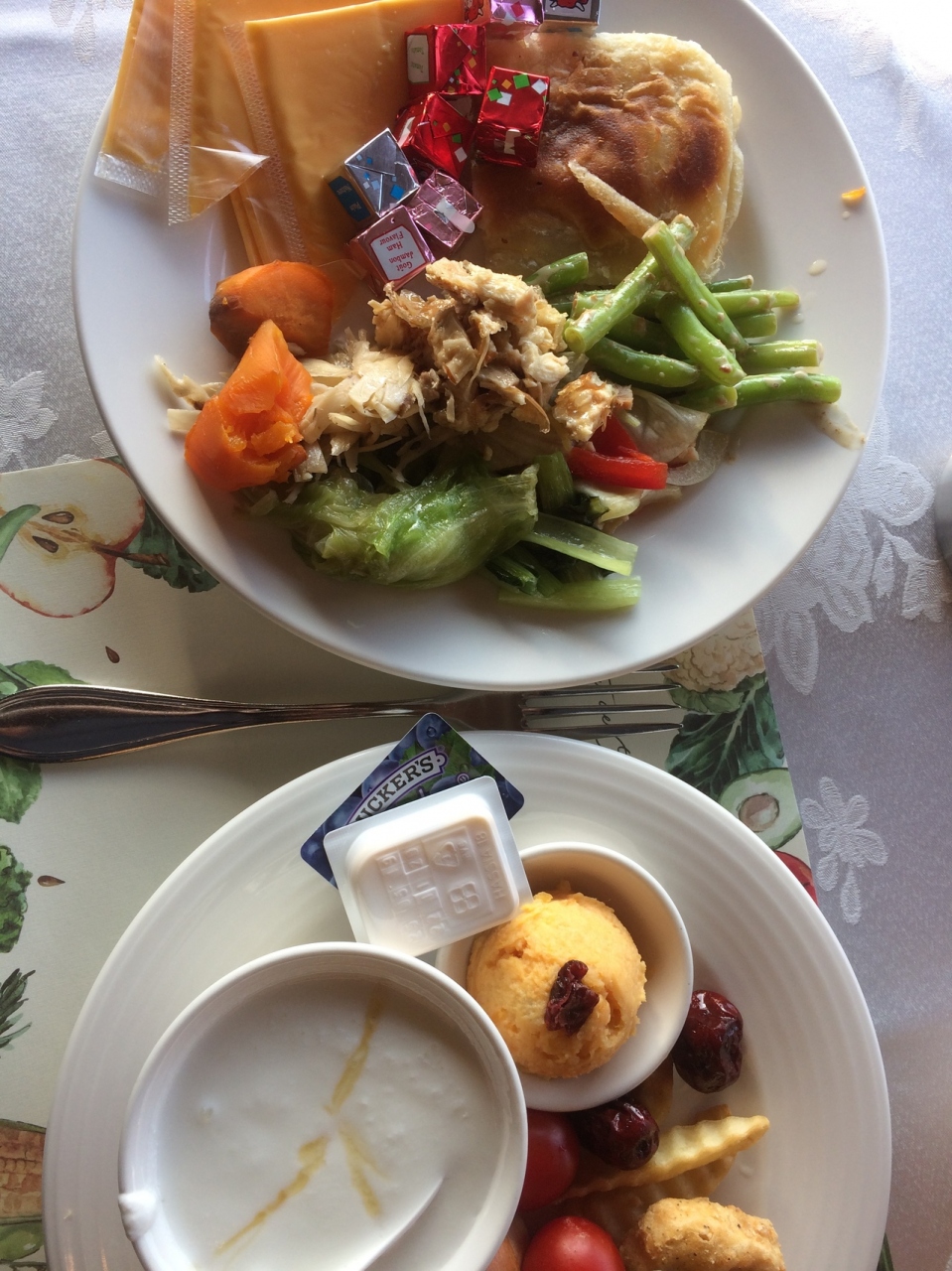 夕食はついていない宿泊コースにしたので、近くの夜市で食べました。朝食はサラダやチーズが豊富にありました。日本語新聞もあり、部屋にもコーヒーメーカーがありました。バスは、浴槽が広々していて気持ちよかったです。