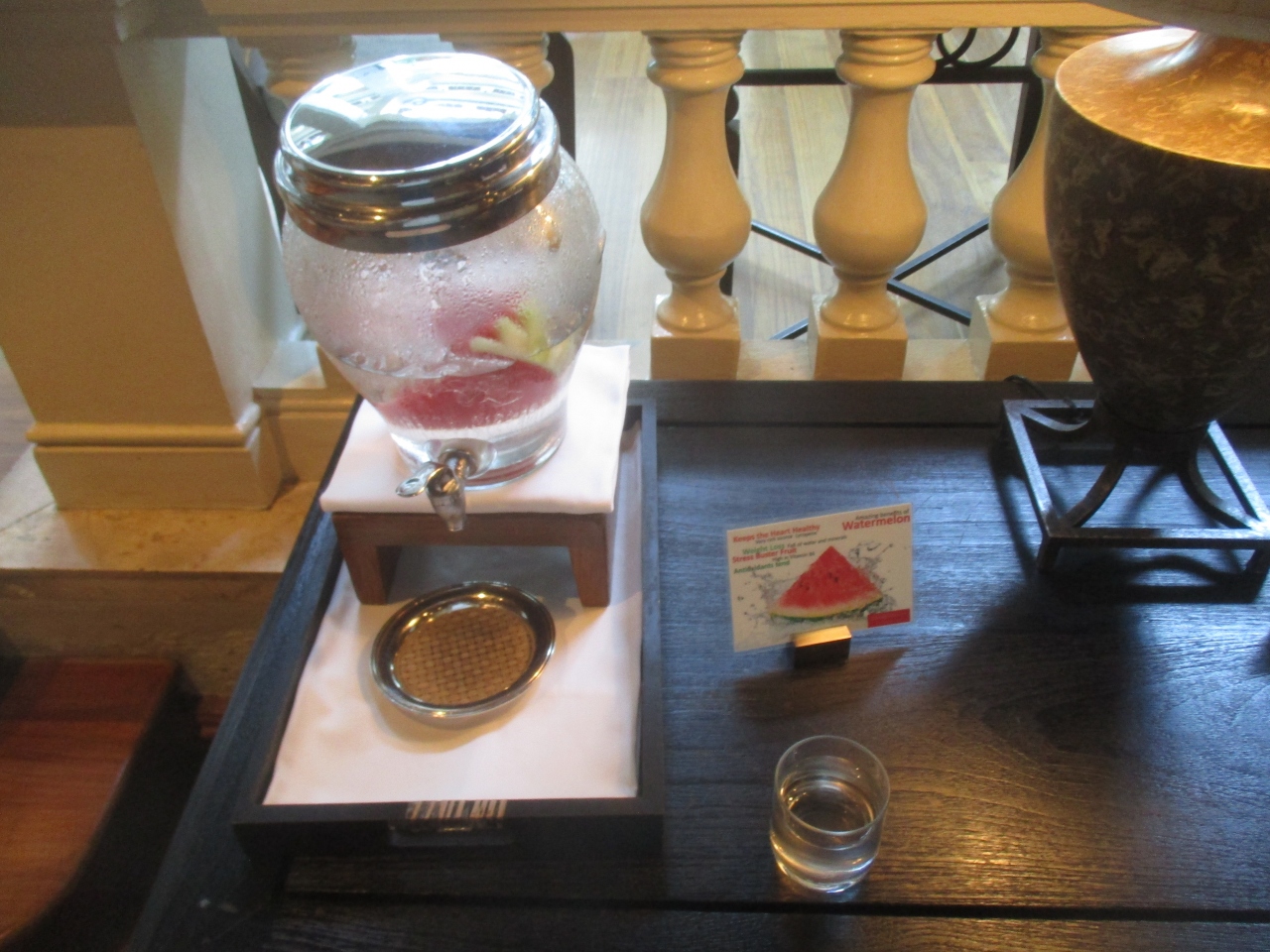 チェックインのときにポーター兼スタッフがウェルカムドリンクを持ってきてくれました。過去に宿泊の実績があると、スタッフはそれだけで丁寧度が増した感じでした。チェックインの手間が省け、前に連絡してあった個人メールアドレスがすでに登録されていました。また、アプリケーションの用紙は記入が不要でサインするだけでした。