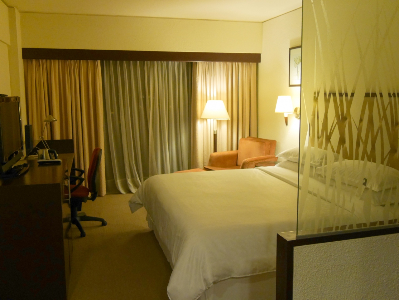 バスタブ、ドライヤー、湯沸かしポット、セイフティボックス、冷蔵庫などがあり、部屋はまずまずの広さです。