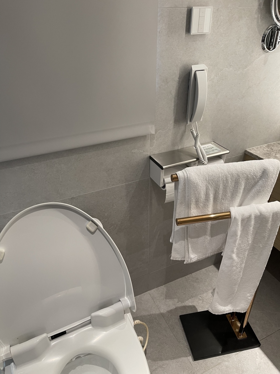 ベッドの上にはピローが幾つか並び、充電も十分できるコンセントがありました。バスルームは、まあまあの広さで、トイレとは同じスペースでしたが、浴槽とシャワーでガラス張りで仕切られていたので、足が濡れなくて良かったです。