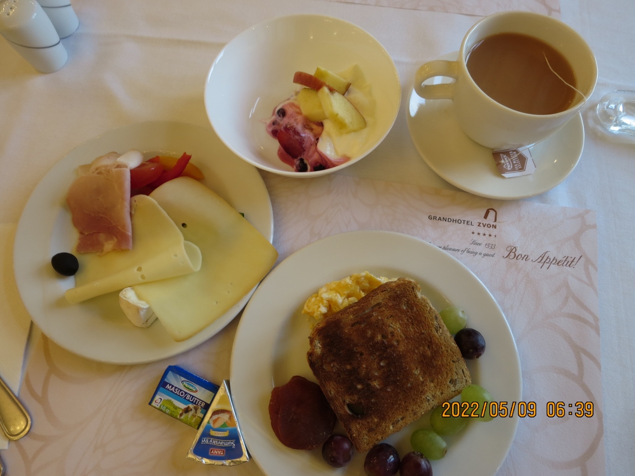 朝食は6:30から、内容はよくある冷たいものと温かいものがあります。