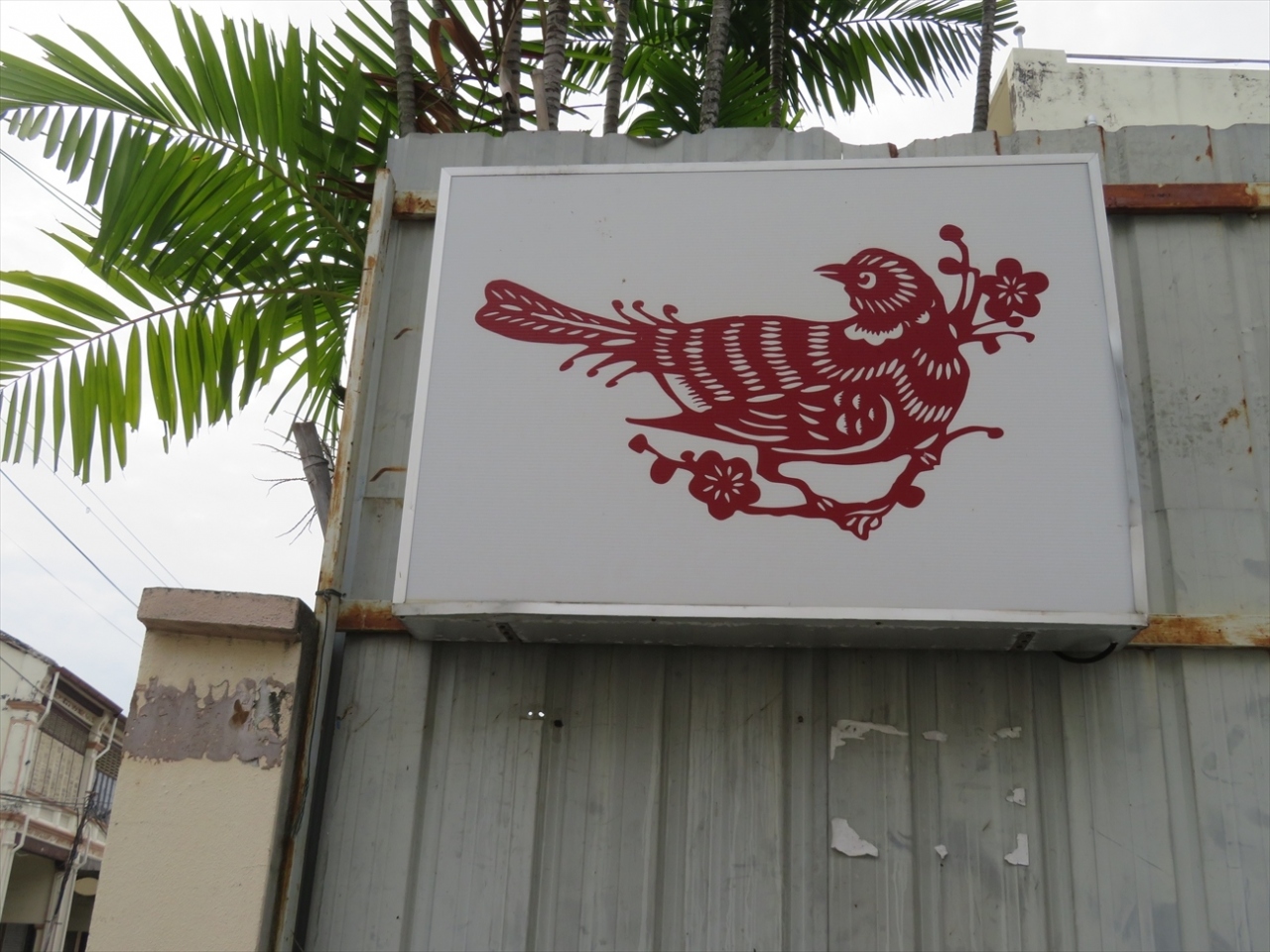 最初はちょっと見つけにくいですが、路地の入口の塀に赤い鳥の絵柄の中国の切り絵看板が出ているのが目印。