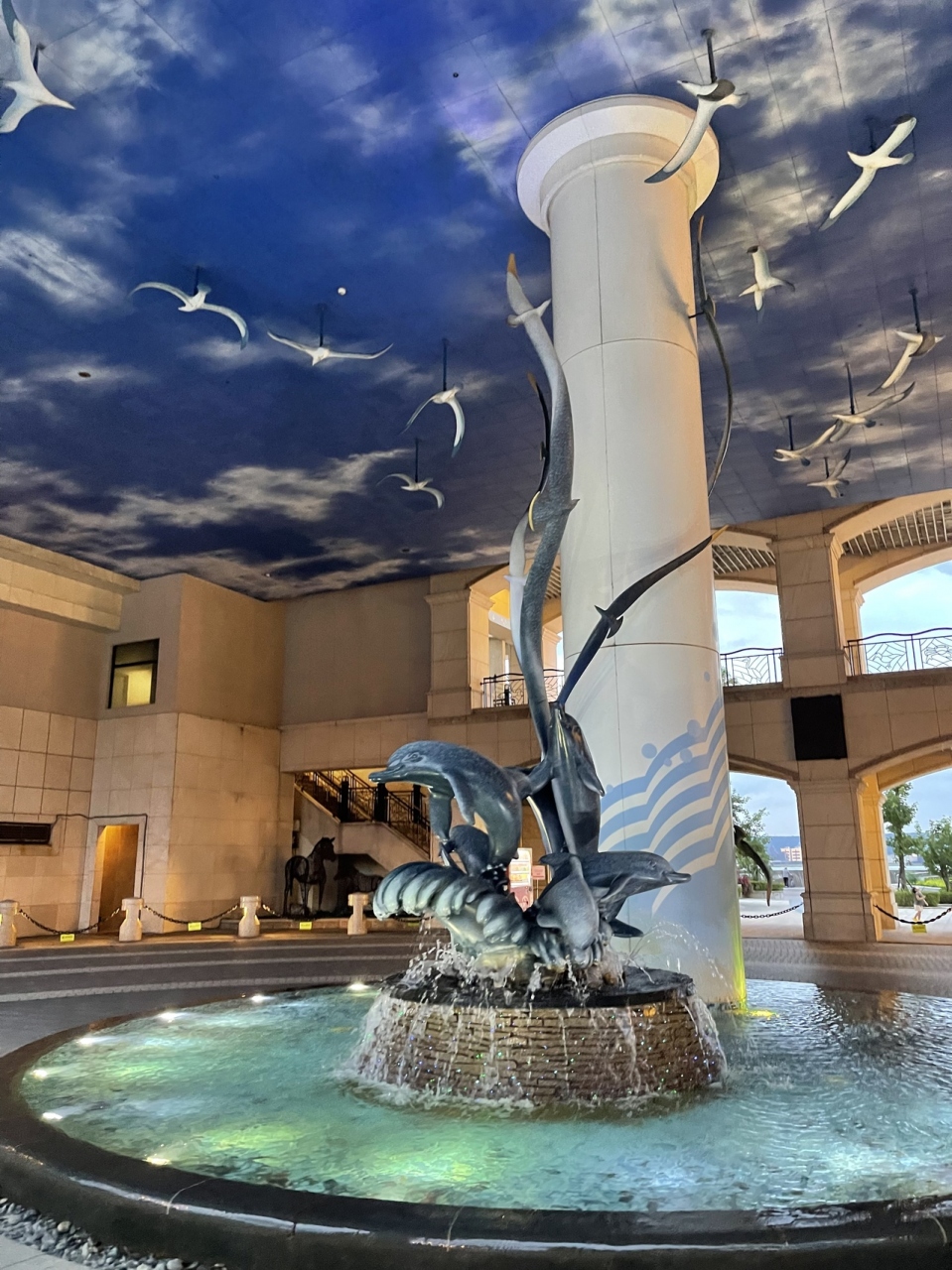淡水の漁人碼頭エリアにある豪華なホテルです。噴水があって、西欧のリゾート感がありました。淡水河と桟橋の奥に沈んでいく夕日をのぞむことができるバルコニーがあります。夕日の時間には、特に夕日側の部屋の宿泊客がバルコニーに出ていました。