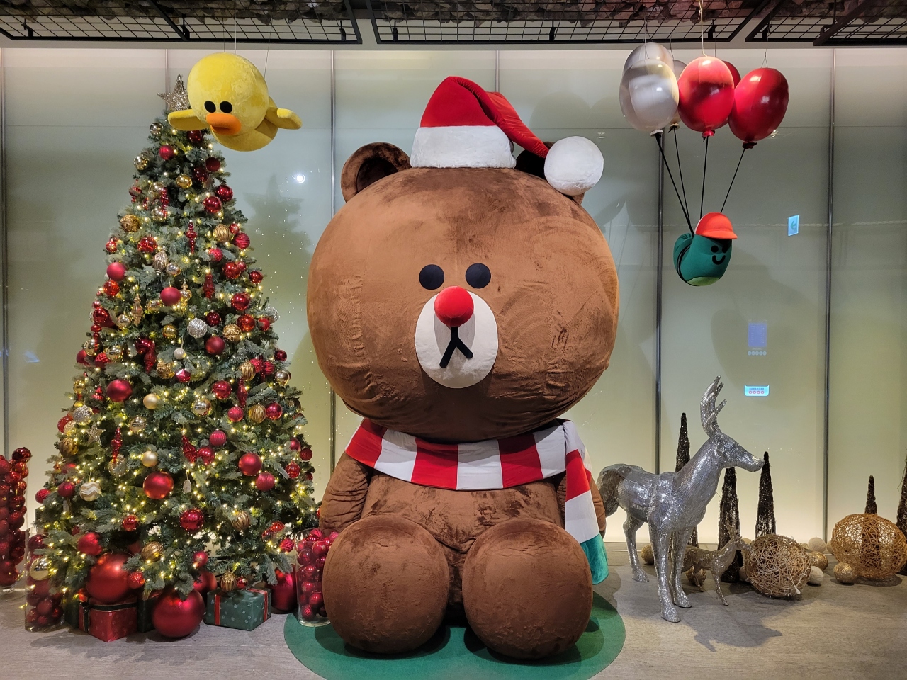 ラインフレンズの部屋があるホテル。入口でブラウンたちが迎えてくれる。