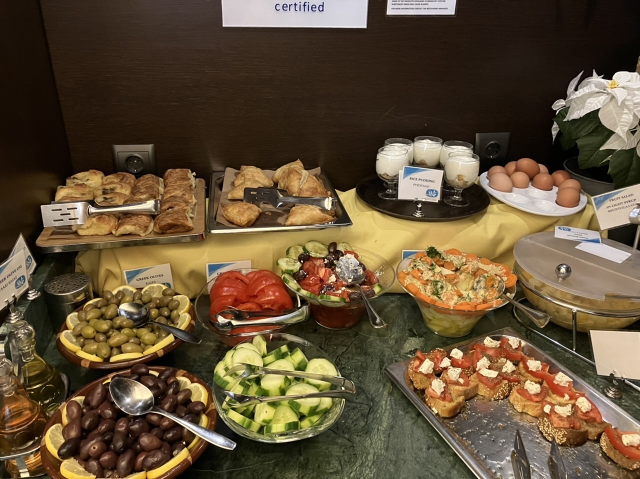 朝食も種類が豊富で、ギリシャヨーグルトやギリシャのスイーツまであり、お腹がパンパンになるまでいただきました。