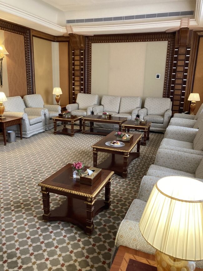 リッツのアップグレードがエグくて驚いてる。これロビーじゃなくて部屋。首脳会談とかできちゃうやつw2人なのにどこ座ろう。使用人がお茶作るような部屋もある。