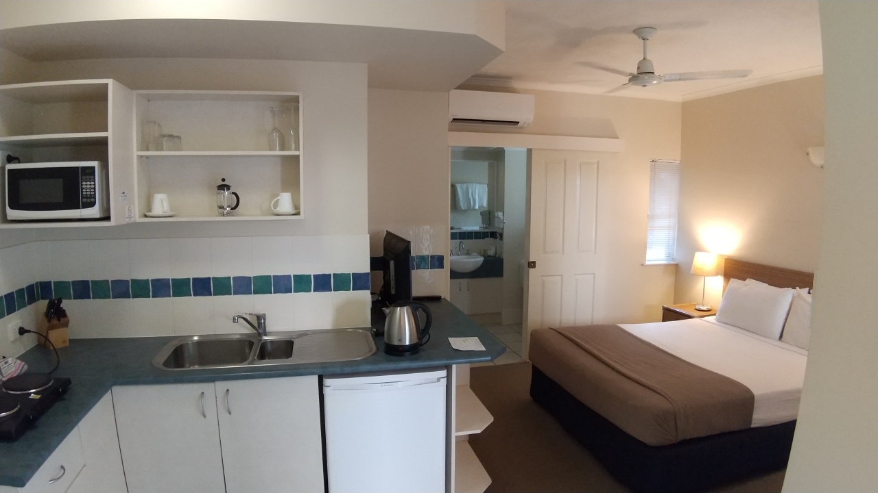 ポートダグラスホテルの中で比較的安価で立地も良い場所なので選びました。キッチンには食器、冷蔵庫、電子レンジ、ポット等自炊に必要な最低限の設備は整っており、ステーキを焼いたり、パンを焼いたりしました。また使用しませんでしたがプールもあり、プチリゾートステイできます。