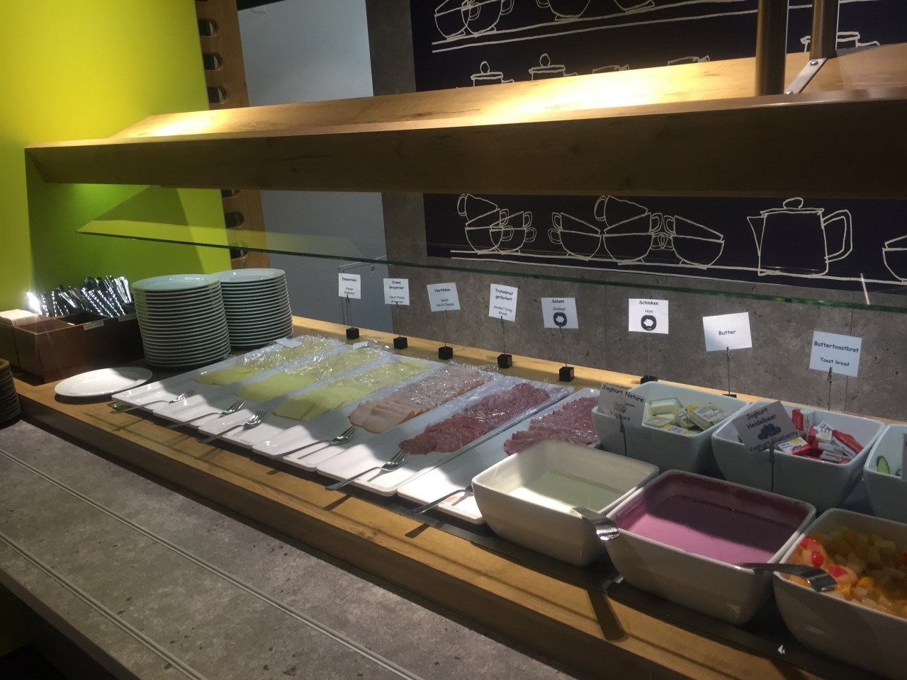 チューリッヒ到着予定が18:00以降だったため、空港近くのホテルを選びました。今回はメインがグリンデルワルト、ツェルマットなので、他の地区はリーズナブルなホテルで我慢することにしました。部屋は日本のビジネスホテルのような感じです。ビューは中庭向でしかも1階のためほとんど向かいの部屋しか見えません。朝食はパン、チーズ、ハム中心ですが色んな種類が並んでました。