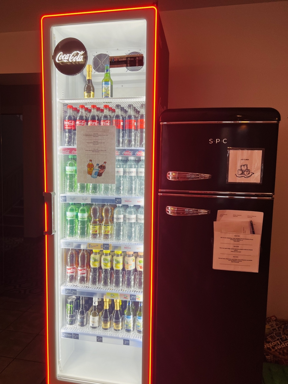 朝食会場は常時利用できてコーヒーなどはフリー。水やお酒は冷蔵庫に入っているので、お金は横の箱に入れて下さいとのこと。これ皆さんちゃんと支払ってるんでしょうかね。。。