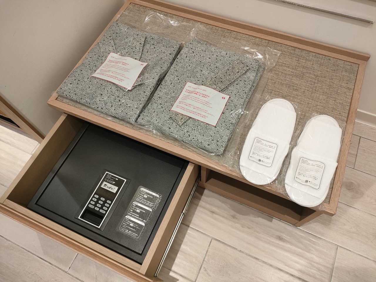 部屋:冷蔵庫、金庫、ポット、ティーバッグ等、無料のお水2本、スリッパ、浴衣
