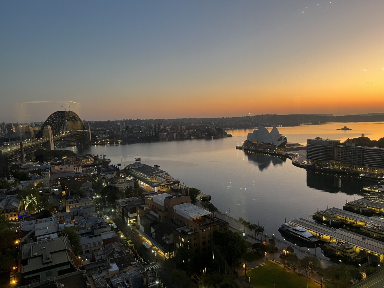 4年ぶりの海外旅行で、シドニーを訪れた。夜着の便で着き check in したところ、無料で部屋をグレードアップしてくれたようだった。31階のコーナーの部屋の眺望は素晴らしく、夢のような世界が広がっていた。夜景、朝焼け、昼のいずれでも見事な景色が広がるのである。これまでの旅行ではなっかような幸運であった。