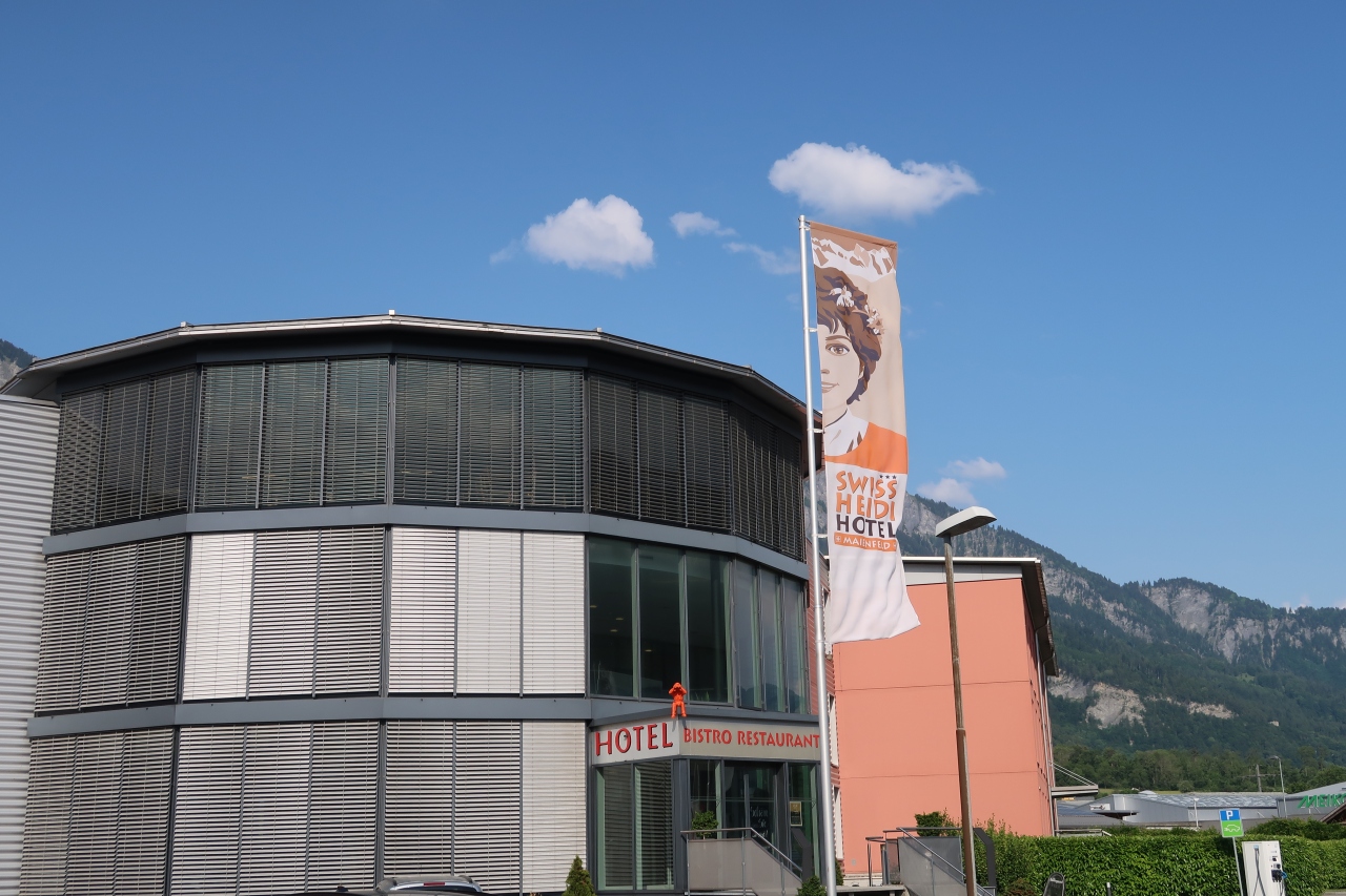 マイエンフェルト駅から徒歩2分の立地にあるホテルで、ハイジが「二つの高い塔があるように見える岩山」と言っていたファルニクス山が、太陽の光を浴びてきれいに見えました。フロントの周辺には、これまで制作されたハイジの映画の写真がたくさん飾られていました。