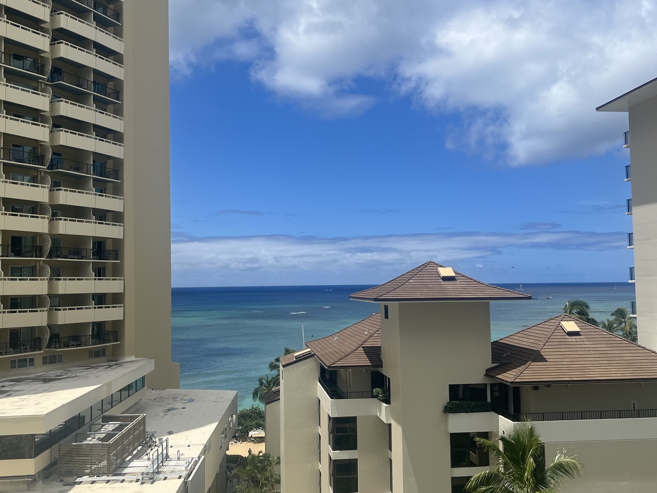 海はシェラトンワイキキとハレクラニの間から見えます。
