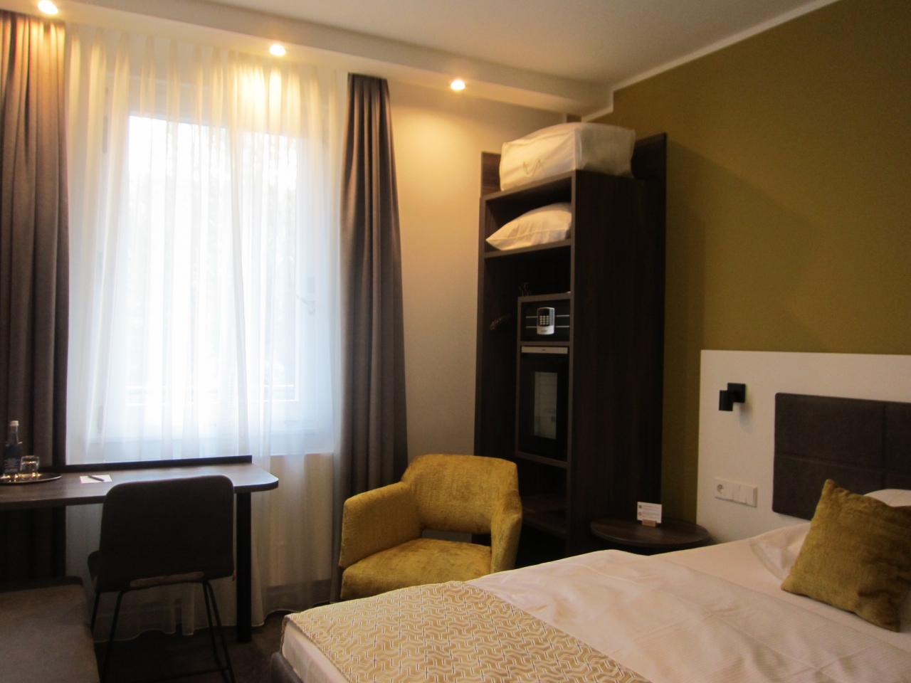 駅から離れていますが、ケーニヒ通りを歩くのでショッピングしたり見学できるので問題ないと思います。ホテルの入るのに少し階段があります。スロープもないので持ち上げないといけませんでした。バスタブありました。周りは静かでした。