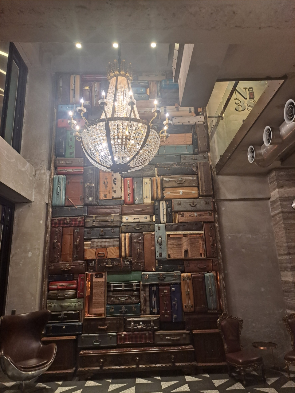 ホテルの入口に入ると、壁一面のスーツケースが目を引きます。