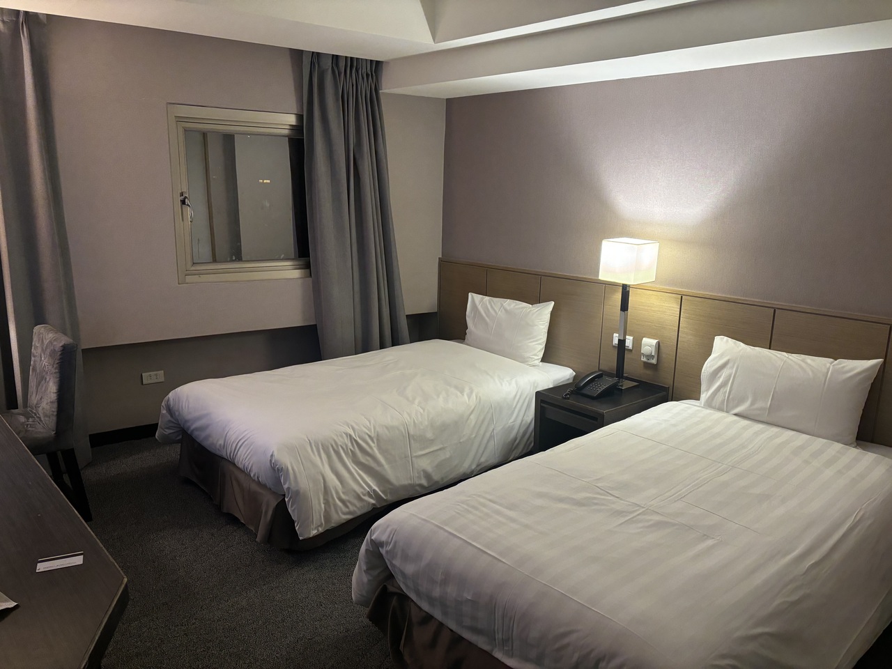 近くにはコンビニ、サウナがある。さらには寧夏夜市、迪化街も徒歩圏内でとても便利。部屋の広さは、ツインだったが、ビジネスホテルと同じくらいの広さで、狭さは感じない。口湖ではホテルがぼろいとあったが、そこまで古さは感じなかった。