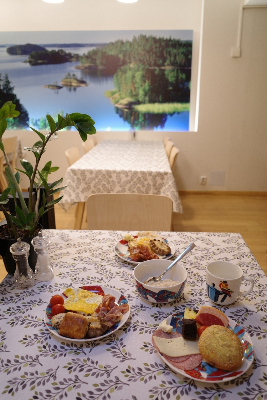朝食のビュッフェも美味しく、マリメッコの食器でかわいく大満足です。
