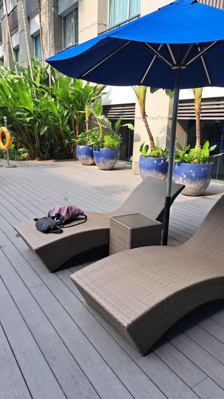 プールは巨大で、ショッピングモールの6階あたりに相当する場所にあるとは思えません。周囲はホテルの建物で囲われているので、必ず日陰部分があって、とても過ごしやすかった。