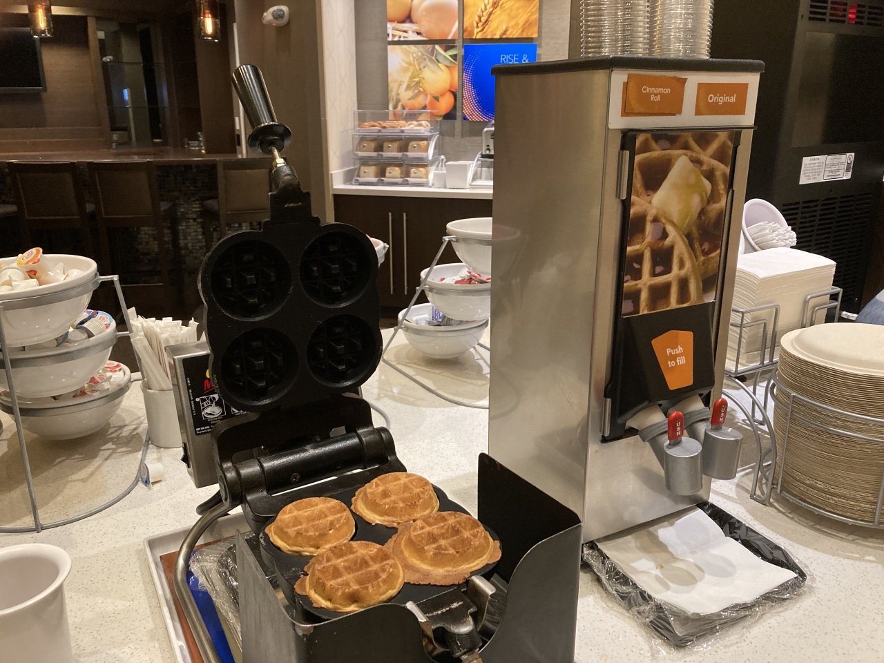 コーヒー(各種)、オレンジジュース、ヨーグルト、果物(バナナ、オレンジ)、シリアル、パン各種、ソーセージ(2種)、スクランブルエッグ、自分で焼くワッフルメーカーがあり、これが結構美味しかったのでお薦め。
