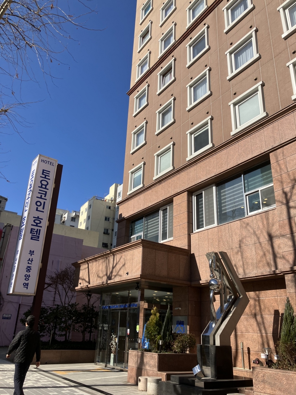 釜山の東横インのなかでも、安いこちらを選んだのですが、駅から結構歩きます。最寄りの中央駅で10分くらいなのですが、真っ直ぐで迷わない分単調で、遠く感じるので…近場で食事も、店がないわけではなさそうなのですが、西面とか釜山駅前の方がアクセス含めて便利です。ただバス停はすぐで便数もあり、慣れてしまえば西面でも南浦洞でも出やすく、白瀬文化村にもバス一本で行けて良かったです。