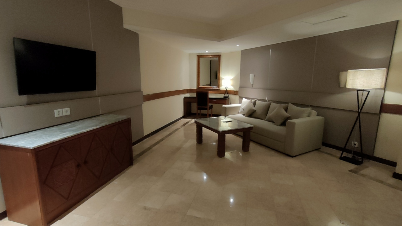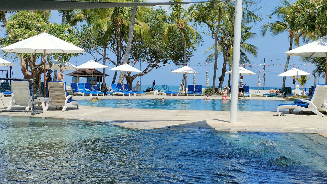 ガーデンビューとプールビューの2つのタイプの部屋があるようです。わたしたちはガーデンビューだったのですが、スイートにアップグレードしてくれました。リビングルームが無駄に広かったです。プールが大きく、チェアーがたくさん置かれていたので寝転んでゆっくりスマホで大リーグを見ていました。プールの向こうが防波堤になっていてその向こうが海です。海はきれいではありません。