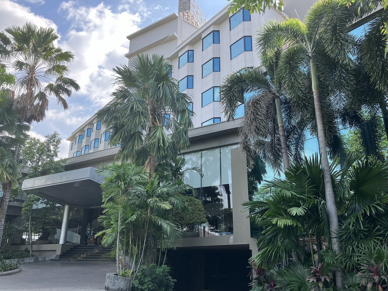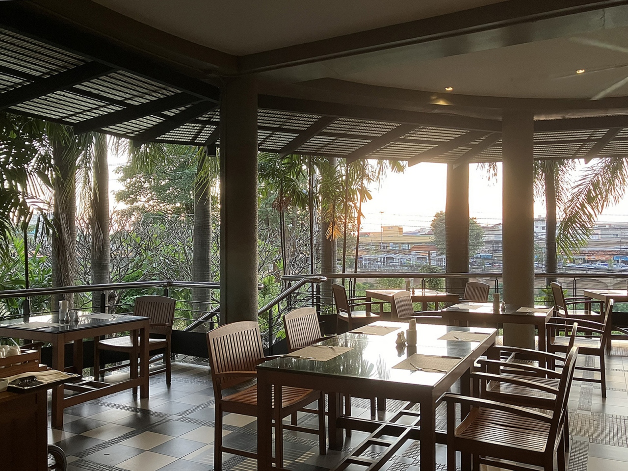 幹線道路の少し奥、緑に囲まれた静かな場所にあるシティリゾート風のホテルです。駐車場のコンクリートの壁の前にも目隠しの竹が植えられているなど、無粋な人工物をできるだけ排除しようとの演出に抜かりがありません。到着するとベル係が荷物をピックアップ、2台あるレセプションデスクで着席しての手続きと、このあたり高級ホテル仕様です。2021年にフルリノベーションしたという館内は綺麗、ロビーも清楚な雰囲気です。隣接するレストランの割引券もいただき、エスコートされて客室に向かいます。最上階7階の角部屋にアサインいただきました。やはり客室も優しい色合いで清楚な雰囲気で清潔感があり、広さも十分、ピサヌロークは高層の建物が少ないため市街が一望できますし、窓も一部開閉できます。バスルームはシャワーブースだけですが、明かり取りの窓もあります。ただアメニティ類は最低限ですので、歯ブラシなどは各自用意が必要です。大通りに出ればセブンイレブンもありますし、夜に散歩でピサヌローク駅にも行きましたが、寒気であれば汗もかかない距離でした。ゆったり過ごしたいのであれば良い選択だと思います。あっ、大切なことを忘れていました。朝食レストランにはナーン川沿いのテラス席があり、寒気の涼しい朝でしたので、最高に気持ちの良い時間を過ごせました。