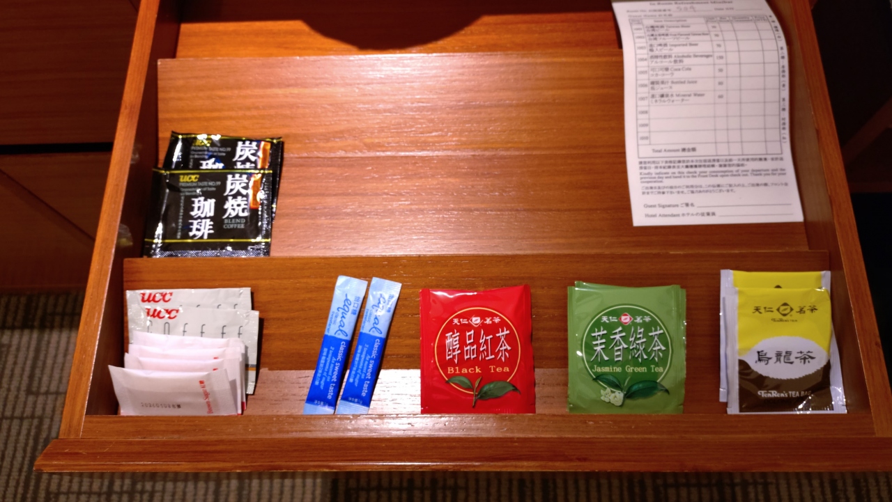 コーヒーと天仁茗茶の紅茶・緑茶・ウーロン茶に、ペットボトルのお水も1人1日1本ありました。