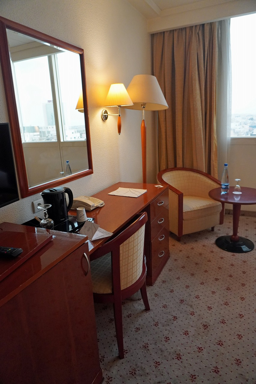 JTBのツアーで2泊しました。阪急交通社のツアーも宿泊していたので日本の旅行会社御用達なのだと思います。このホテルはゴールデン・ヤスミン・グループというチェーンのホテルで、ツアーで宿泊したほとんどがこのグループのホテルでした。チュニスの街中でもかなりの高層ホテルなので目の前の通りにならむ大聖堂や時計塔やチュニス湖まで見渡せます。近くには「Magasin Général」というスーパーマーケットや「Monopurix」もあります。日曜日はメディナの店は全て休みですが、スーパーはオープンしていました。宿泊中の夕食と朝食はこのホテルのレストランでいただきましたが、濃厚なジュースからデザートのフルーツ迄とても美味しかったです。部屋も広くバスルームも広かったです。