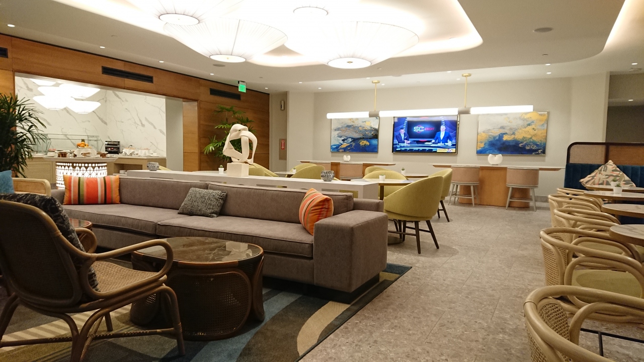 ハードドリンクが充実した広いラウンジだが、混雑するので相席は必至。