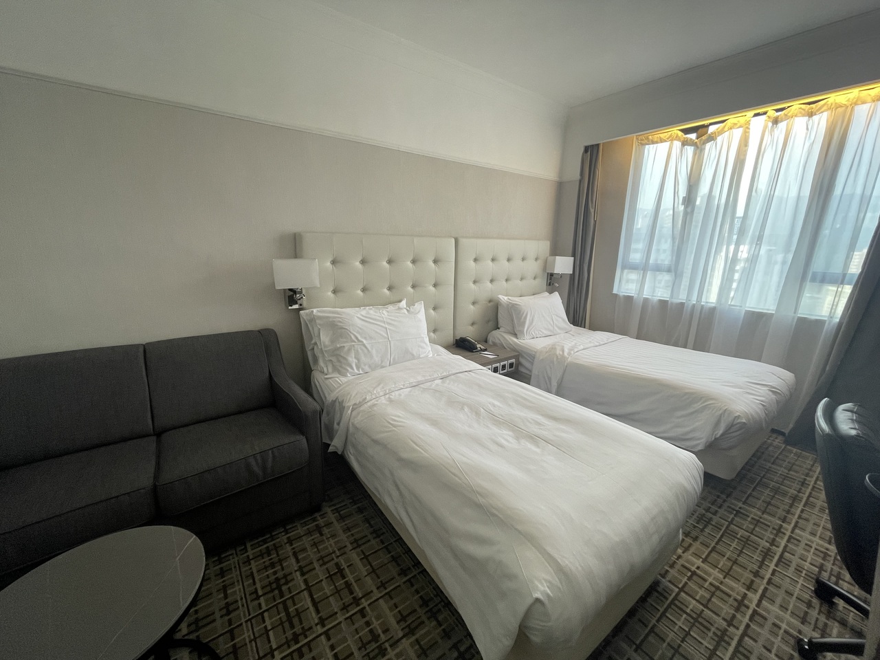 ホテルは郊外にありますがコンシェルジュで予約制のシャトルバスを利用すると尖沙咀DFSまで15-20分でとても便利でした。周辺には地元の人が暮らす荃湾の街が広がり買い物や食事にも便利です。